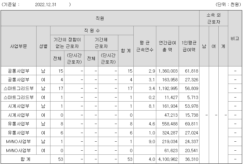 | 사업부문 | 성별 | 직원수 | 평균근속연수 | 평균연봉(백만) |