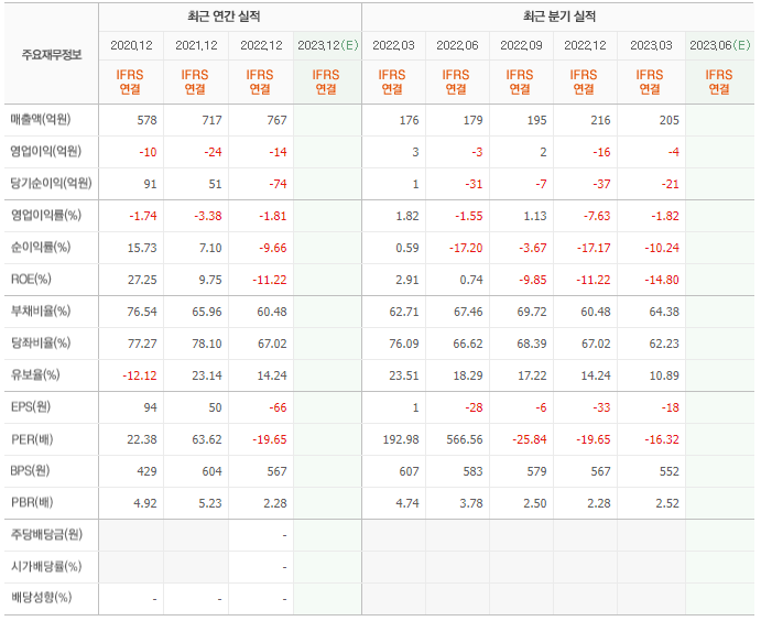 2022년 매출은 767억, 영업이익은 -14억, 당기순이익은 -74억입니다. 그리고 영업이익률은 -1.81%입니다.