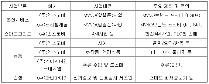 당사는 1970년 02월 28일에 설립되어 MVNO(알뜰폰), 스마트그리드, 바이오, 시계 및 화장품의 제조 및 판매 관련 사업을 주요목적사업으로 하고 있으며, 1985년 01월 17일 발행주식을 한국증권선물거래소가 개설하는 유가증권시장에 상장한 주권상장법인입니다.