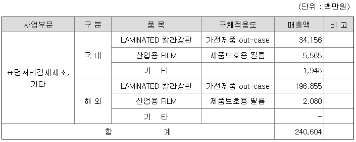 1) 주요 제품 등의 현황