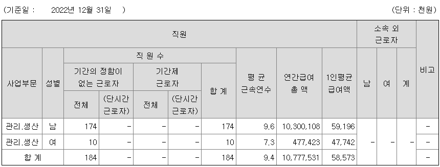 | 사업부문 | 성별 | 직원수 | 평균근속연수 | 평균연봉(백만) |