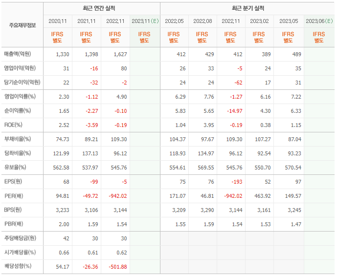 2022년 매출은 1627억, 영업이익은 80억, 당기순이익은 -2억입니다. 그리고 영업이익률은 4.90%입니다.