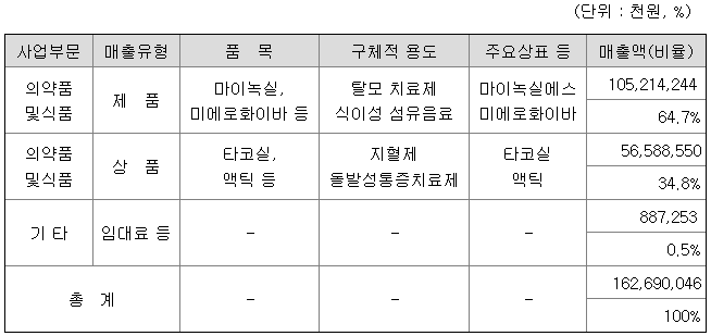 의약품, 음료 등을 생산, 판매하고 있으며 주요 제품 및 상품은 아래와 같습니다.