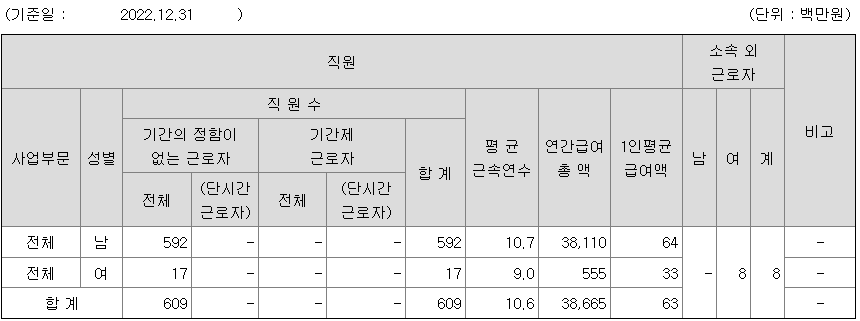 | 사업부문 | 성별 | 직원수 | 평균근속연수 | 평균연봉(백만) |