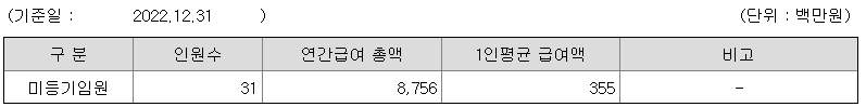 미등기임원의 평균연봉은 3억 5500만원이고 직원수는 31명입니다.