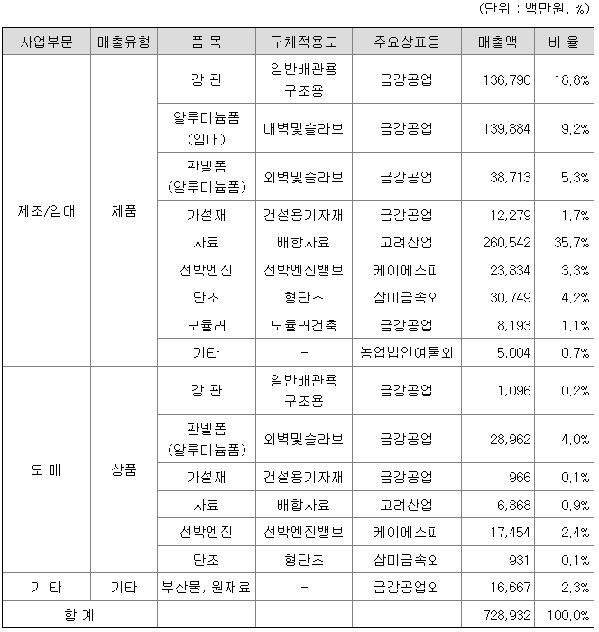 당사는 강관 및 건설용 가설자재를 전문생산하는 종합 메이커로서 주요 사업부문은 강관부문, 판넬사업부문, 가설재부문, 사료부문, 모듈러건축부문으로 구성되어 있으며, 각 사업부문별로 주요 제품을 생산하여 판매 및 임대하고 있습니다. 당기의 각 부문별 매출액 및 비중은 다음과 같습니다.