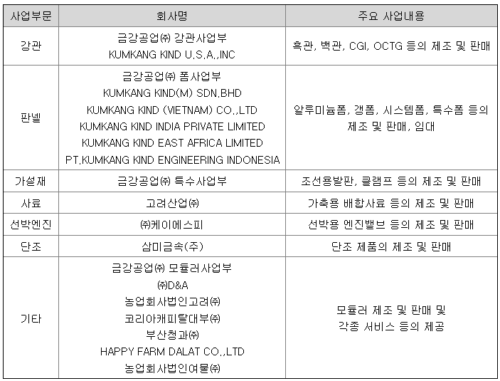 당사는 1979년 08월 금강철관(주)으로 설립되어 1980년 12월 상호를 금강공업(주)로 변경하였으며, 배관용, 구조용 강관 제조 및 판매, 폼웍시스템(알루미늄폼, 갱폼, 시스템폼, 특수폼) 제조 및 임대업 등을 주요사업으로 영위하고 있는 강관 및 건설용 가설자재 종합 메이커 업체입니다. 당사 및 종속회사의 사업부문별 현황을 요약하면 아래와 같습니다.