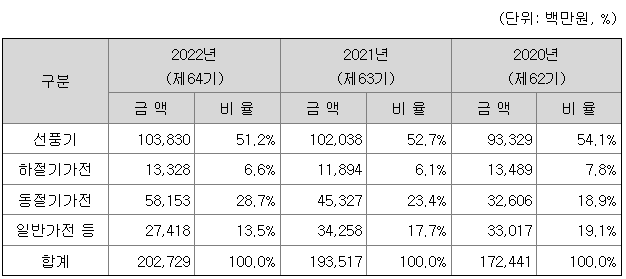 또한 원자재의 수급 상 환율과 유가변동에 민감하여, 최근 들어 중국에서의 싸고 저급한 상품의 국내 유입으로 인하여 치열한 가격 경쟁을 유발하고 있기도 했습니다. 2022년의 경우 하절기 선풍기 매출은 1,038억원으로 전년 대비 약 2% 판매가 증가하였고, 선풍기 외 하절기가전(제습기,이동식에어컨 등)의 매출은 133억원으로 전년 대비 약 11%증가 하였습니다.