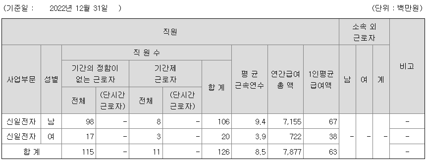 | 사업부문 | 성별 | 직원수 | 평균근속연수 | 평균연봉(백만) |