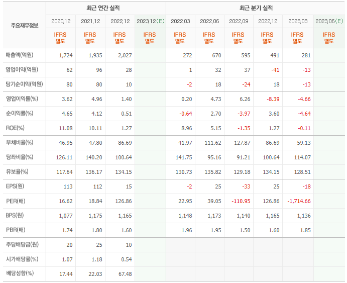 2022년 매출은 2027억, 영업이익은 28억, 당기순이익은 10억입니다. 그리고 영업이익률은 1.40%입니다.