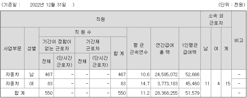 | 사업부문 | 성별 | 직원수 | 평균근속연수 | 평균연봉(백만) |
