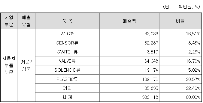 당사는 자동차 부품 제조 전문 업체로서 사업부문을 구분하여 운영하고 있지 않습니다. 다만 주요 제품군을 TMS(엔진 온도관리 시스템 부품), EMS(엔진 온도, 진동, 압력 등 측정 및 신호 전달을 위한 센서 및 스위치 부품), EP(엔지니어링 플라스틱 경량화 부품), 친환경부품 등으로 구분하고 있습니다.