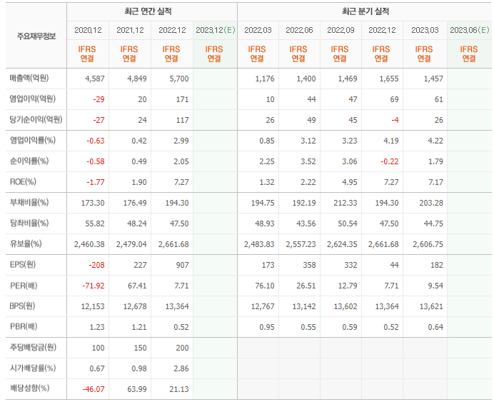 2022년 매출은 5700억, 영업이익은 171억, 당기순이익은 117억입니다. 그리고 영업이익률은 2.99%입니다.