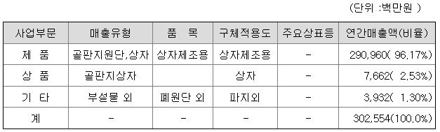 골판지 원단 및 골판지 상자 일괄 생산 판매하는 골판지 전문업체로서 업계 상위에 있으며, 또한, 3중골판지(빠렛트)시장이 수요의 증가로 인한 업계 상위를 유지하고 있음.