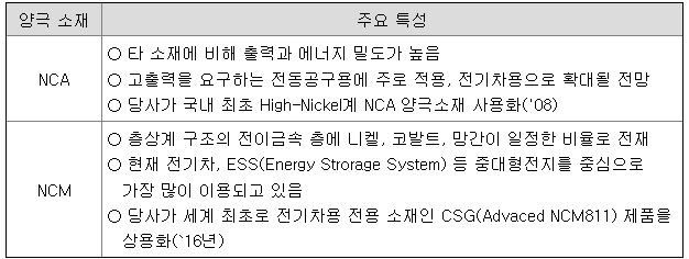 당사의 NCA 양극재는 니켈 함량 80% 이상의 제품으로 높은 에너지 밀도 및 고출력의 성능을 보유하고 있습니다. 고출력의 장점을 바탕으로, 당사의 NCA 제품은 주로 전동공구 시장을 대상으로 사업을 영위해 왔으나 최근 전기차용 배터리에 적용이 확대 되면서 전기차 시장으로의 판매 성장이 매우 빠르게 진행 되고 있습니다.