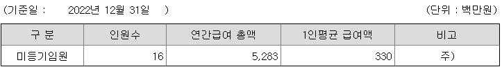 미등기임원의 평균연봉은 3억 3000만원이고 직원수는 16명입니다.