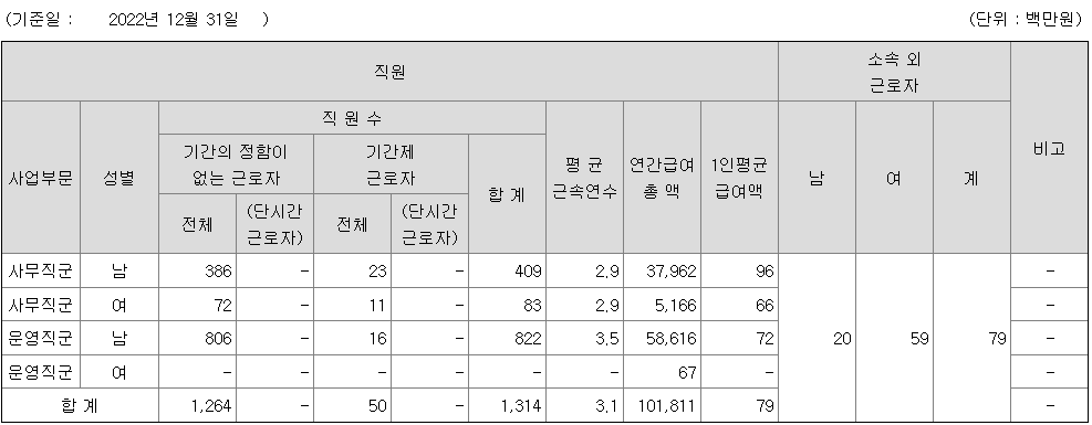 | 사업부문 | 성별 | 직원수 | 평균근속연수 | 평균연봉(백만) |