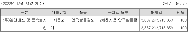 당사와 연결대상 종속회사는 2차전지 양극활물질을 제조, 판매하고 있으며, 매출액 및 총매출액에서 차지하는 비율은 다음과 같습니다.