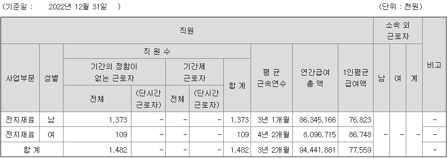 | 전지재료 | 남 | 1,373 | 3년 1개월 | 76 |