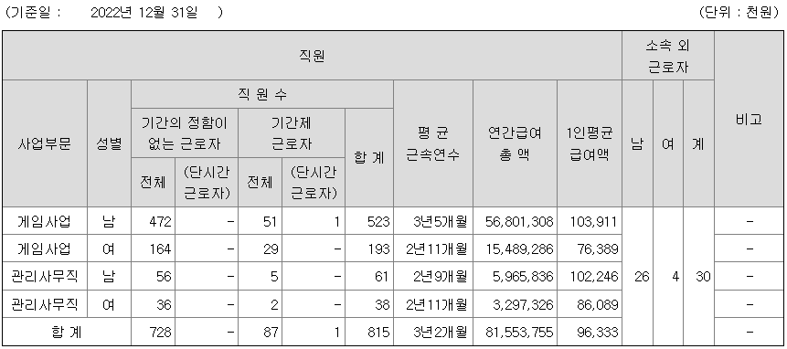 펄어비스 연봉 2022년 기준 공시자료