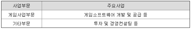 당사는 연결회사 기준으로 게임소프트웨어의 개발 및 퍼블리싱 사업 등을 영위하고 있습니다. 지배회사인 당사와 종속회사인 CCP ehf. 등은 게임소프트웨어 개발 및 게임 서비스 공급업 등을 목적사업으로 하고 있으며, 게임소프트웨어를 개발하여 직접 퍼블리싱 및 지역별 퍼블리셔를 통해 게임을 유통하고 있습니다.