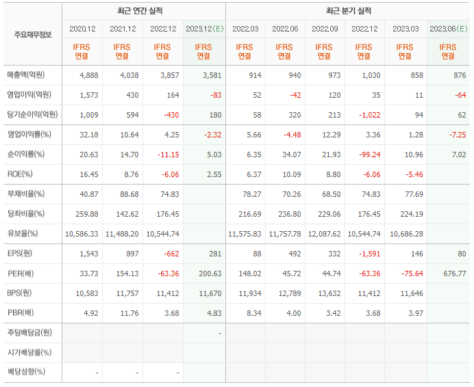 2022년 매출은 3857억, 영업이익은 164억, 당기순이익은 -430억입니다. 그리고 영업이익률은 4.25%입니다.