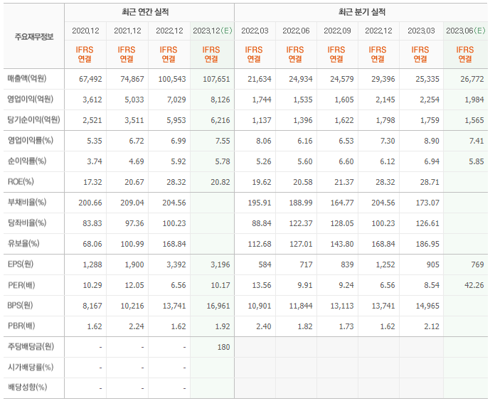 2022년 실적은 10조 543억, 영업이익은 7029억입니다. 그리고 영업이익률은 6.99%입니다.