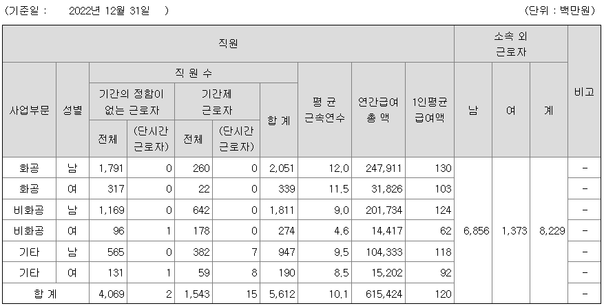 | 사업부문 | 성별 | 직원수 | 평균근속연수 | 평균연봉(백만) |