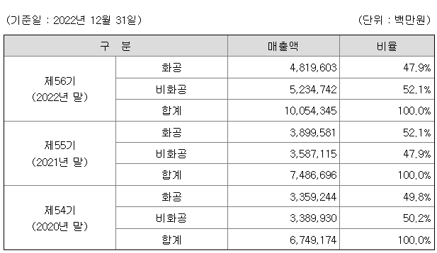비화공 부문에서는 산업, 환경, 바이오플랜트 사업을 수행합니다. 산업플랜트 산업은 산업 생산시설 및 인프라 설비를 건설하는 산업입니다. 환경플랜트 산업은 폐기물 소각, 수처리, 대기오염방지 등 환경 설비 건설 및 운영 서비스 사업을 포함합니다. 바이오플랜트 산업은 바이오 의약품 및 관련 제품의 생산 설비를 건설하는 산업입니다.