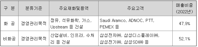 당사는 전 세계 플랜트 시장에서 플랜트 사업을 전개하고 있으며, 사업부문은 엔지니어링 업무 성격에 따라 화공과 비화공으로 구분하고 있습니다.