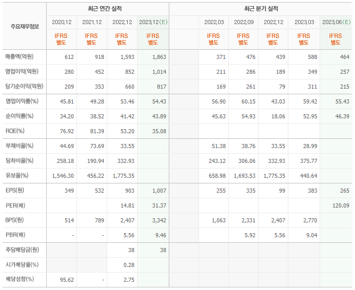 2022년 매출은 1593억, 영업이익은 852억, 당기순이익은 660억입니다. 그리고 영업이익률은 53.46%입니다.