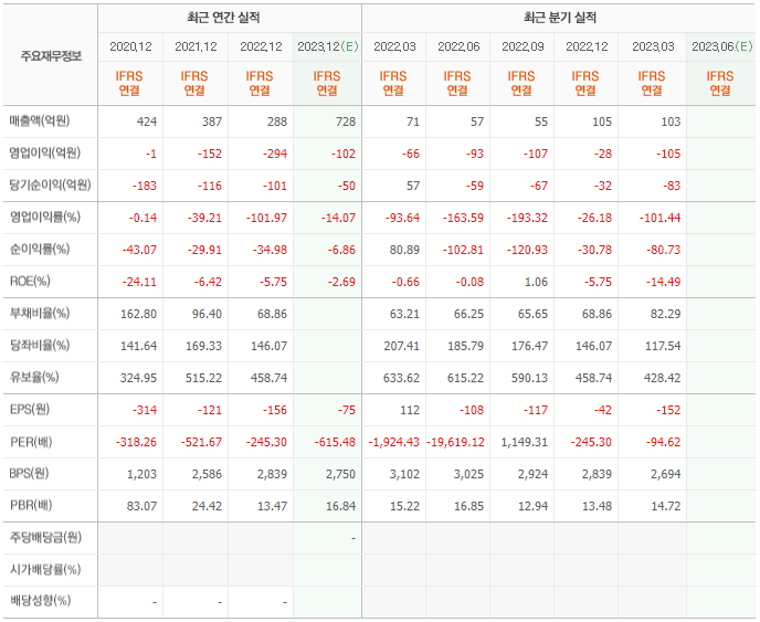 2022년 매출은 288억, 영업이익은 -294억, 당기순이익은 -101억입니다. 그리고 영업이익률은 -101.97%입니다.