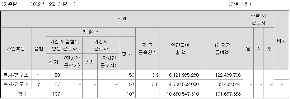 | 사업부문 | 성별 | 직원수 | 평균근속연수 | 평균연봉(백만) |