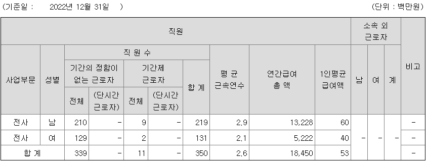 | 사업부문 | 성별 | 직원수 | 평균근속연수 | 평균연봉(백만) |
