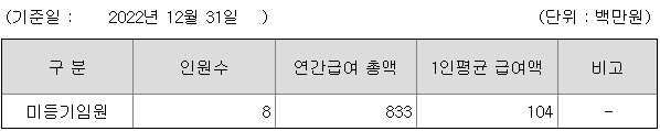 미등기임원의 평균연봉은 1억 400만원이고 직원수는 8명입니다.