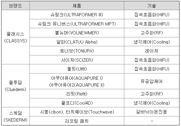 당사는 미용목적을 위한 의료기기 사업을 영위하는 클래시스 브랜드와 미용기기 사업을 영위하는 클루덤 브랜드, 그리고 개인용 뷰티 디바이스 및 화장품 사업을 영위하는 스케덤 브랜드를 운영하고 있습니다.