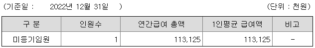 미등기임원의 평균연봉은 1억 1300만원이고 직원수는 1명입니다.