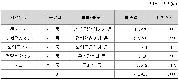 당사의 사업분야는 크게 전자소재(LCD식각액첨가제, OLED소재, 반도체공정 소재 등), 2차전지 소재(전해질, 전해액첨가제), 의약품 소재(의약품중간체), 정밀화학 소재 입니다.