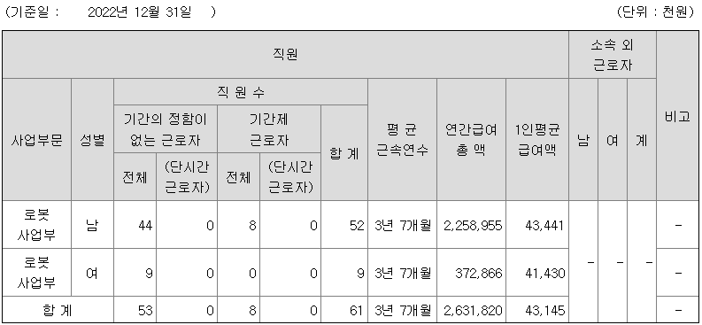 | 사업부문 | 성별 | 직원수 | 평균근속연수 | 평균연봉(백만) |