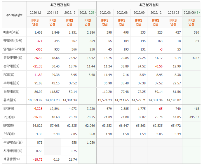 2022년 매출은 1951억, 영업이익은 467억, 당기순이익은 366억입니다. 그리고 영업이익률은 23.92%입니다.