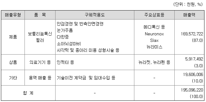 당사는 중요한 사업으로 클로스트리디움 보툴리눔 A형독소 (Clostridium botulinum Toxin Type A) 및 보툴리눔 독소를 이용한 바이오 의약품의 연구·개발 및 제조·판매를 영위하고 있습니다. 주력 제품인 보툴리눔 A형 독소 의약품 메디톡신주®(Neuronox®)는 당사가 세계 4번째 독자적인 원천기술로 개발한 제품입니다.