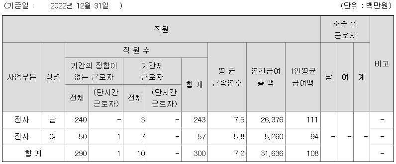 | 사업부문 | 성별 | 직원수 | 평균근속연수 | 평균연봉(백만) |