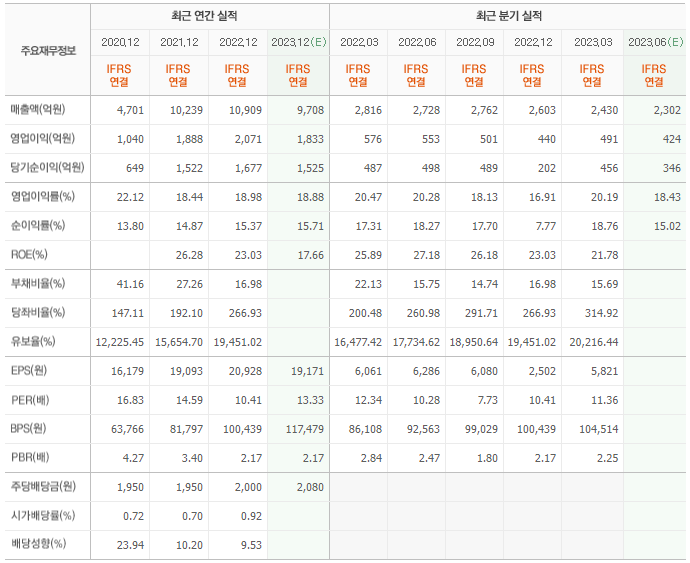2022년 매출은 1조 909억, 영업이익은 2071억, 당기순이익은 1677억입니다. 그리고 영업이익률은 18.98%입니다.