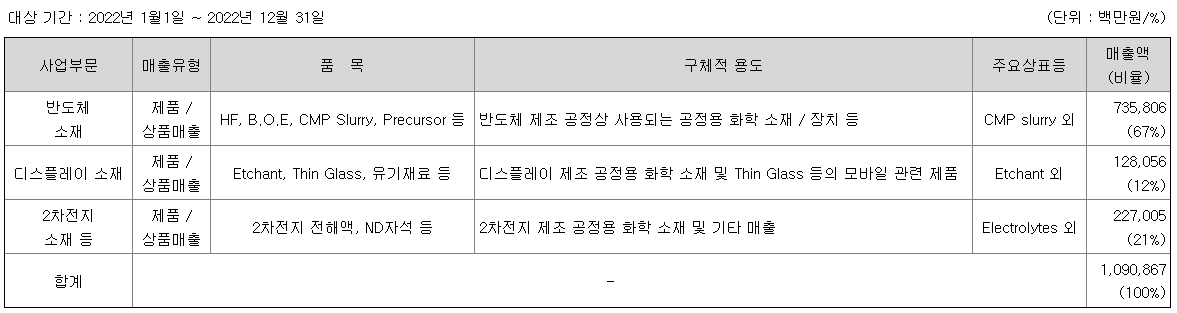 당사는 현재 삼성전자, 삼성디스플레이, SK하이닉스, LG디스플레이 등 국내 반도체 및 디스플레이 제조사에 공정용 화학 소재 등을 안정적으로 공급하고 있습니다. 또한삼성SDI, SK온, LG에너지솔루션 등의 국내 2차전지 제조사에 관련 제품을 공급하고있습니다.