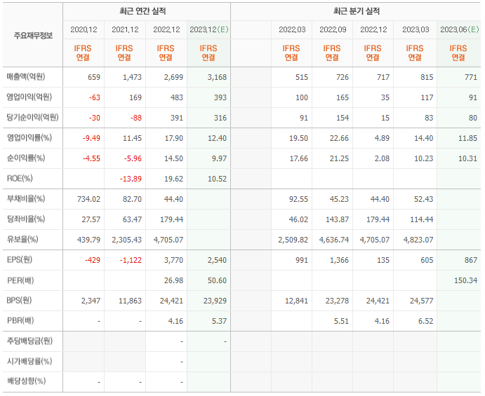 2022년 매출은 2699억, 영업이익은 483억, 당기순이익은 391억입니다. 그리고 영업이익률은 17.90%입니다.
