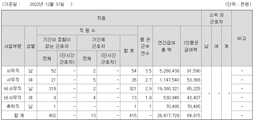 | 사업부문 | 성별 | 직원수 | 평균근속연수 | 평균연봉(백만) |