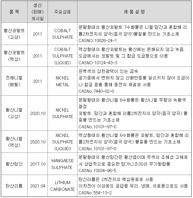 양극재는 주로 코발트, 니켈, 망간 및 리튬 등의 물질로 구성이 되어 있는데, 당사는 황산코발트, 황산니켈, 황산망간 및 탄산리튬의 형태로 양극재의 기초가 되는 소재를 생산하여 판매하고 있습니다.