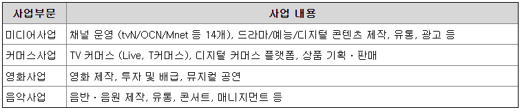 당사의 사업은 크게 4개 부문으로 구성되어 있습니다. 방송채널 및 콘텐츠 제작, 광고 등을 영위하는 미디어사업, TV 및 온라인 몰을 통한 상품 판매의 커머스사업, 영화의 제작, 투자, 배급 등의 영화사업, 음반ㆍ음원 제작 및 유통, 콘서트 등의 음악사업으로 나누어져 있습니다.