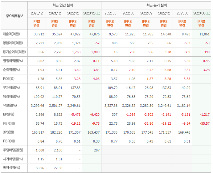 2022년 매출은 4조 7922억, 영업이익은 1374억, 당기순이익은 -1768억입니다. 그리고 영업이익률은 2.87%입니다.