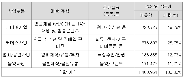 당사의 사업은 크게 4개 부문으로 구성되어 있습니다. 방송채널 및 콘텐츠 제작, 광고 등을 영위하는 미디어사업, TV 및 온라인 몰을 통한 상품 판매의 커머스사업, 영화의 제작, 투자, 배급 등의 영화사업, 음반ㆍ음원 제작 및 유통, 콘서트 등의 음악사업으로 나누어져 있습니다.